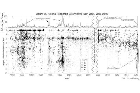 Sometimes keeping a seismic station running during winter is difficult. USGS technicians Kelly Swinford and Amberlee Darold are shown here getting a St. Helens station back online on March 30, 2016.Seth Moran / USGS The USGS and the Pacific Northwest Seismic Network has arrays of seismometers on many of the Cascade volcanoes to watch these earthquakes, so hopefully we'll know well in advance if any of these volcanoes are waking up. It isn't easy to keep the seismic array on these volcanoes running during the winter, as the picture of the seismometer on Mount St. Helens above image shows! So you should be impressed that we have the near real-time seismic data at our fingertips. One such story of a volcano recharging is being written right now at Mount St. Helens in Washington. Since the start of 2016 (see below), an earthquake swarm has been detected underneath the currently-quiet Washington volcano. These earthquakes have been occurring from depths of ~2 to over 7 kilometers beneath the volcano. USGS volcanologists and seismologists are interpreting this swarm as a response to the slow "recharging" for the volcano, where new magma is rising up underneath St. Helens as it slumbers. As the magma intrudes, it imparts pressure on the rock around it and it heats up water/releases gases that can add to that pressure. This generates small earthquakes as the rocks shift in response to that stress.