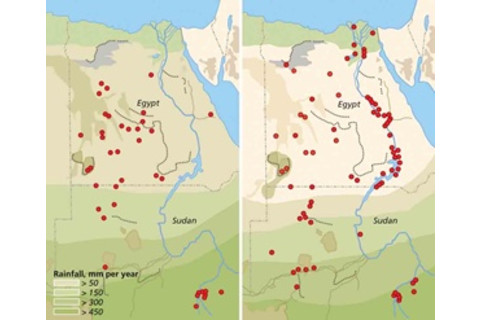 In 2006, researchers used radiocarbon-dated material from 150 archaeological sites in the eastern Sahara to map a change in settlement patterns that coincided with increased desertification of the region. From 7000 to 5300 B.C. (left), human settlements, indicated above by red dots, were established throughout the area. From 5300 to 3500 B.C., as the desert encroached, settlements clustered in the fertile Nile Valley. Jay Smith