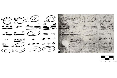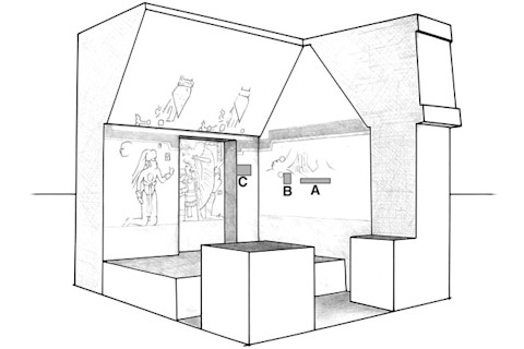 The Xultun scribe's chamber, with A, B, and C showing the locations of the calculations.