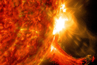 A massive cloud of solar material was blasted out into space when a flare erupted from the Sun on Oct. 2, 2014. The action was captured by NASA's Solar Dynamics Observatory. (Source: NASA/SDO) On October 2, the Sun let loose with a bright flash of radiation — a solar flare — propelling a cloud of particles probably weighing a trillion tons or so out into space at a million miles per hour.