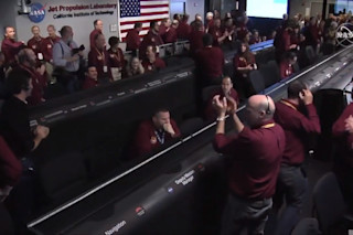 The InSight mission team rejoices in Mission Control after the probe successfully landed on Mars. (Credit: NASA)