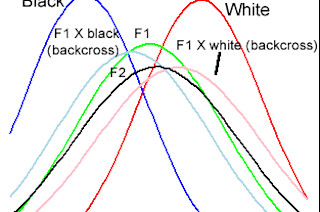 To come to the estimate the authors made some assumptions. For example, they assumed that blacks and whites were disjoint on the genes which encoded skin color in terms of their variants. Because these two populations lay at the opposite poles of the phenotypic distribution for humans it's a natural assumption, but they had nothing to go on besides their hunch at the time. It turns out though that to a good first approximation this is actually a valid assumption. If you assume that the two populations are fixed at the allelic variants, that they don't have segregating alleles which encode variation, then whites and blacks should exhibit the same variance due to environmental forces. This is what the authors saw. Using skin reflectance measures it seems that blacks and whites varied the same amount about their mean. If the two populations are approximately homozygote then the F1 generation, which are heterozygotes, should be between the two parental populations in trait value, but not exhibit much greater variance. Recall that they'd inherit a black and white copy at every locus. Therefore, all the variance in this population should also be environmental, rather than genetic. The real action comes in the backcrosses and the F2 generation. In these two populations segregation will result in a genetic variance component which will inflate the total variance. Therefore, genetic variance on this trait can be estimated like so: