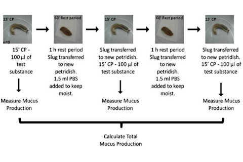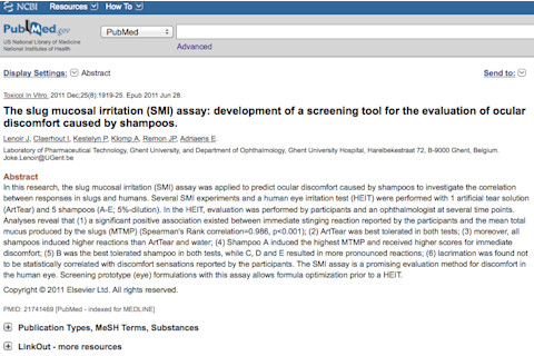The slug mucosal irritation (SMI) assay: development of a screening tool for the evaluation of ocular discomfort caused by shampoos. "In this research, the slug mucosal irritation (SMI) assay was applied to predict ocular discomfort caused by shampoos to investigate the correlation between responses in slugs and humans. Several SMI experiments and a human eye irritation test (HEIT) were performed with 1 artificial tear solution (ArtTear) and 5 shampoos (A-E; 5%-dilution). In the HEIT, evaluation was performed by participants and an ophthalmologist at several time points. Analyses reveal that (1) a significant positive association existed between immediate stinging reaction reported by the participants and the mean total mucus produced by the slugs (MTMP) (Spearman's Rank correlation=0.986, p<0.001); (2) ArtTear was best tolerated in both tests; (3) moreover, all shampoos induced higher reactions than ArtTear and water; (4) Shampoo A induced the highest MTMP and received higher scores for immediate discomfort; (5) B was the best tolerated shampoo in both tests, while C, D and E resulted in more pronounced reactions; (6) lacrimation was found not to be statistically correlated with discomfort sensations reported by the participants. The SMI assay is a promising evaluation method for discomfort in the human eye. Screening prototype (eye) formulations with this assay allows formula optimization prior to a HEIT." Bonus figure from the full text: