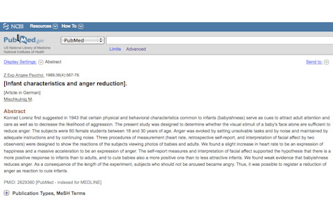 Infant characteristics and anger reduction. "Konrad Lorenz first suggested in 1943 that certain physical and behavioral characteristics common to infants (babyishness) serve as cues to attract adult attention and care as well as to decrease the likelihood of aggression. The present study was designed to determine whether the visual stimuli of a baby's face alone are sufficient to reduce anger. The subjects were 60 female students between 18 and 30 years of age. Anger was evoked by setting unsolvable tasks and by noise and maintained by adequate instructions and by continuing noise. Three procedures of measurement (heart rate, retrospective self-report, and interpretation of facial affect by two observers) were designed to show the reactions of the subjects viewing photos of babies and adults. We found a slight increase in heart rate to be an expression of happiness and a massive acceleration to be an expression of anger. The self-report measures and interpretation of facial affect supported the hypothesis that there is a more positive response to infants than to adults, and to cute babies also a more positive one than to less attractive infants. We found weak evidence that babyishness reduces anger. As a consequence of the length of the experiment, subjects who should not be aroused became angry. Thus, it was possible to register a reduction of anger as reaction to cute infants."