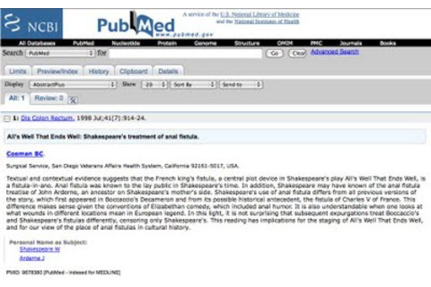 "Textual and contextual evidence suggests that the French king's fistula, a central plot device in Shakespeare's play All's Well That Ends Well, is a fistula-in-ano. Anal fistula was known to the lay public in Shakespeare's time. In addition, Shakespeare may have known of the anal fistula treatise of John Arderne, an ancestor on Shakespeare's mother's side. Shakespeare's use of anal fistula differs from all previous versions of the story, which first appeared in Boccaccio's Decameron and from its possible historical antecedent, the fistula of Charles V of France. This difference makes sense given the conventions of Elizabethan comedy, which included anal humor. "
