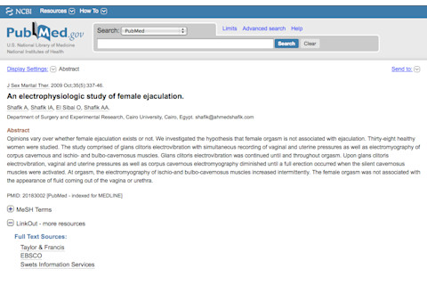 "Opinions vary over whether female ejaculation exists or not. We investigated the hypothesis that female orgasm is not associated with ejaculation. Thirty-eight healthy women were studied. The study comprised of glans clitoris electrovibration with simultaneous recording of vaginal and uterine pressures as well as electromyography of corpus cavernous and ischio- and bulbo-cavernosus muscles. Glans clitoris electrovibration was continued until and throughout orgasm. Upon glans clitoris electrovibration, vaginal and uterine pressures as well as corpus cavernous electromyography diminished until a full erection occurred when the silent cavernosus muscles were activated. At orgasm, the electromyography of ischio-and bulbo-cavernosus muscles increased intermittently. The female orgasm was not associated with the appearance of fluid coming out of the vagina or urethra."