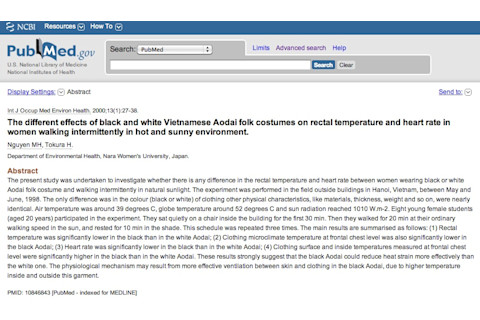 The different effects of black and white Vietnamese Aodai folk costumes on rectal temperature and heart rate in women walking intermittently in hot and sunny environment. "The present study was undertaken to investigate whether there is any difference in the rectal temperature and heart rate between women wearing black or white Aodai folk costume and walking intermittently in natural sunlight. The experiment was performed in the field outside buildings in Hanoi, Vietnam, between May and June, 1998. The only difference was in the colour (black or white) of clothing other physical characteristics, like materials, thickness, weight and so on, were nearly identical. Air temperature was around 39 degrees C, globe temperature around 52 degrees C and sun radiation reached 1010 W.m-2. Eight young female students (aged 20 years) participated in the experiment. They sat quietly on a chair inside the building for the first 30 min. Then they walked for 20 min at their ordinary walking speed in the sun, and rested for 10 min in the shade. This schedule was repeated three times. The main results are summarised as follows: (1) Rectal temperature was significantly lower in the black than in the white Aodai; (2) Clothing microclimate temperature at frontal chest level was also significantly lower in the black Aodai; (3) Heart rate was significantly lower in the black than in the white Aodai; (4) Clothing surface and inside temperatures measured at frontal chest level were significantly higher in the black than in the white Aodai. These results strongly suggest that the black Aodai could reduce heat strain more effectively than the white one. The physiological mechanism may result from more effective ventilation between skin and clothing in the black Aodai, due to higher temperature inside and outside this garment."