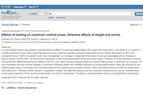 Effects of loading on maximum vertical jumps: Selective effects of weight and inertia. "A novel loading method was applied to explore selective effects of externally added weight (W), weight and inertia (W+I), and inertia (I) on maximum counter-movement jumps (CMJ) performed with arm swing. Externally applied extended rubber bands and/or loaded vest added W, W+I, and I corresponding to 10-40% of subjects' body mass. As expected, an increase in magnitude of all types of load was associated with an increase in ground reaction forces (GRF), as well as with a decrease in both the jumping performance and power output. However, of more importance could be that discernible differences among the effects of W, W+I, and I were recorded despite a relatively narrow loading range. In particular, an increase in W was associated with the minimal changes in movement kinematic pattern and smallest reduction of jumping performance, while also allowing for the highest power output. Conversely, W+I was associated with the highest ground reaction forces. Finally, the lowest maxima of GRF and power were associated with I. Although further research is apparently needed, the obtained finding could be of potential importance not only for understanding fundamental properties of the neuromuscular system, but also for optimization of loading in standard athletic training and rehabilitation procedures."