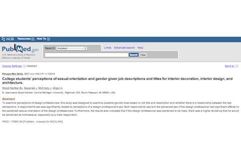 College students' perceptions of sexual orientation and gender given job descriptions and titles for interior decoration, interior design, and architecture. "To examine perceptions of design professionals, this study was designed to examine possible gender-bias based on job title and description and whether there is a relationship between the two perceptions. A respondent's sex was significantly related to perceptions of a design professional's sex. Both respondents' sex and the perceived sex of the design professional had significant effects on the perceived sexual orientation of the design professionals. Furthermore, the results also indicated that if the design professional was perceived to be male, there was a higher tendency that he would be perceived as homosexual, especially by a male respondent."