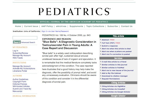 “‘Blue balls’ is a widely used colloquialism describing scrotal pain after high, sustained sexual arousal unrelieved because of lack of orgasm and ejaculation. It is remarkable that the medical literature completely lacks acknowledgment of this condition. The case reported here illustrates that a good history may help make the diagnosis, offer the possibility of prompt relief, and avoid any unnecessary evaluation.”