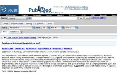 "In 4 experiments, the authors asked whether pigeons (Columba livia) would show metamemory by choosing to study a sample stimulus before taking a memory test...The findings of all of these experiments suggest the absence of metamemory in pigeons."