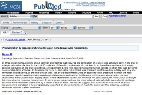 "In three experiments, pigeons chose between alternatives that required the completion of a small ratio schedule early in the trial or a larger ratio schedule later in the trial... These experiments found clear evidence for "procrastination"--the choice of a larger but more delayed response requirement."
