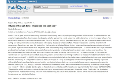 Intuition through time: what does the seer see? "OBJECTIVE: A great deal of human activity is involved in anticipating the future, from predicting the next influenza strain to the expectations that underlie the placebo effect. Most models of anticipation take for granted that events unfold in a unidirectional flow of time, from past to future. Two experiments were conducted to test this assumption. DESIGN: Pupillary dilation, spontaneous blinking, and eye movements were tracked before, during, and after participants viewed photographs with varying degrees of emotional affect. RESULTS: Data contributed by 74 unselected volunteers in two experiments showed that: (a) pupillary dilation and spontaneous blinking were found to increase more before emotional versus calm photos (combined P = .00009), (b) horizontal eye movements indicated a brain hemisphere asymmetry before viewing photos, appropriate to both the emotionality (P = .05) and the valence of the future images (P = .01), (c) participants selected for independently obtaining significant differential effects in pupillary dilation showed positive correlations between their eye movements before versus during exposure to randomly selected photos (P = .002), and (d) a possible "transtemporal interference" effect was observed when the probability of observing future images was varied (P = .05 [two-tailed])... ...CONCLUSIONS: These studies, which replicate conceptual similar experiments, suggest that sometimes seers do see the future."