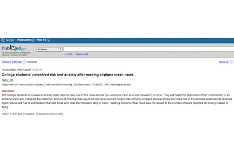 "328 college students in midwest and west coast regions read one of five news stories (four airplane crash and one irrelevant) or none. They estimated the likelihood of their victimization in an airplane crash and indicated the maximum amount of time that they would be willing to spend driving in lieu of flying. Analysis showed those who read one of the airplane crash stories reported higher perceived risk of victimization than did those who read the irrelevant story or none. Reading airplane crash news was not related to the number of hours reported for driving instead of flying."