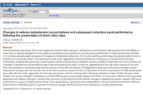 Changes in salivary testosterone concentrations and subsequent voluntary squat performance following the presentation of short video clips. "Previous studies have shown that visual images can produce rapid changes in testosterone concentrations. We explored the acute effects of video clips on salivary testosterone and cortisol concentrations and subsequent voluntary squat performance in highly trained male athletes (n=12). Saliva samples were collected on 6 occasions immediately before and 15 min after watching a brief video clip (approximately 4 min in duration) on a computer screen. The watching of a sad, erotic, aggressive, training motivational, humorous or a neutral control clip was randomised. Subjects then performed a squat workout aimed at producing a 3 repetition maximum (3RM) lift. Significant (P<0.001) relative (%) increases in testosterone concentrations were noted with watching the erotic, humorous, aggressive and training videos (versus control and sad), with testosterone decreasing significantly (versus control) after the sad clip. The aggressive video also produced an elevated cortisol response (% change) and more so than the control and humorous videos (P<0.001). A significant (P<0.003) improvement in 3RM performance was noted after the erotic, aggressive and training clips (versus control). A strong within-individual correlation (mean r=0.85) was also noted between the relative changes in testosterone and the 3RM squats across all video sessions (P<0.001). In conclusion, different video clips were associated with different changes in salivary free hormone concentrations and the relative changes in testosterone closely mapped 3RM squat performance in a group of highly trained males. Thus, speculatively, using short video presentations in the pre-workout environment offers an opportunity for understanding the outcomes of hormonal change, athlete behaviour and subsequent voluntary performance."