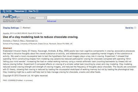 Use of a clay modeling task to reduce chocolate craving. "Elaborated Intrusion theory (EI theory; Kavanagh, Andrade, & May, 2005) posits two main cognitive components in craving: associative processes that lead to intrusive thoughts about the craved substance or activity, and elaborative processes supporting mental imagery of the substance or activity. We used a novel visuospatial task to test the hypothesis that visual imagery plays a key role in craving. Experiment 1 showed that spending 10min constructing shapes from modeling clay (plasticine) reduced participants' craving for chocolate compared with spending 10min 'letting your mind wander'. Increasing the load on verbal working memory using a mental arithmetic task (counting backwards by threes) did not reduce craving further. Experiment 2 compared effects on craving of a simpler verbal task (counting by ones) and clay modeling. Clay modeling reduced overall craving strength and strength of craving imagery, and reduced the frequency of thoughts about chocolate. The results are consistent with EI theory, showing that craving is reduced by loading the visuospatial sketchpad of working memory but not by loading the phonological loop. Clay modeling might be a useful self-help tool to help manage craving for chocolate, snacks and other foods."