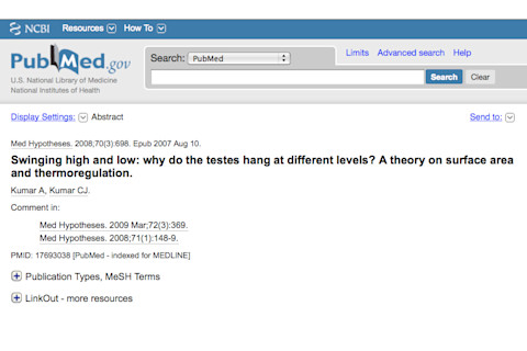 Swinging high and low: Why do the testes hang at different levels? A theory on surface area and thermoregulation. "Anatomically, one or the other half of the scrotal sac hangs at a lower level than the other. The testes, housed within the sacs are also situated, suspended, one slightly lower than its other counterpart. While many theories on why and how of the testicular levels have been proposed, including those engendered by vascular, functional, embryological or evolutionary influences, none of the proposed scientific reasons are totally convincing. In our view, one additional, yet overlooked cause for the naturally displaced level could be, simply, to expose more surface area of the active organ to cooler environs. While it is an accepted fact that suspension of the scrotum outside the abdominal cavity is paramount to the functional efficiency of testes in a preferred lower temperature – it still does not address the question – why hang at different levels?... In effect, just by suspension at two levels, nearly one entire extra surface is available for thermoregulation and cooling. That is, the surface area available now becomes two lateral, plus two halves of the two medial. This extra area available to the testes, probably is, yet another a significant but overlooked embryonic factor that dictates differential rates of descent and displacement of anatomical levels of twin reproductive male organs."