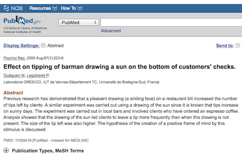 "Previous research has demonstrated that a pleasant drawing (a smiling face) on a restaurant bill increased the number of tips left by clients. A similar experiment was carried out using a drawing of the sun since it is known that tips increase on sunny days. The experiment was carried out in local bars and involved clients who have ordered an espresso coffee. Analysis showed that the drawing of the sun led clients to leave a tip more frequently than when this drawing is not present. The size of the tip left was also higher. The hypothesis of the creation of a positive frame of mind by this stimulus is discussed."