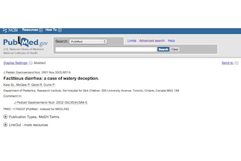 "Falsification of illness occurs when a patient fabricates symptoms or induces a physical illness. A recent review of the literature covering the past 3 decades identified 42 published case studies of falsified illness in children younger than 18 years of age (1). The psychiatric term for illness falsification is “factitious disorder,” which is defined as an intentional, self-inflicted, or fabricated illness or symptom motivated solely by the individual's need to assume the sick role, without external incentives (2). Children are at risk of developing a chronic pattern of illness falsification with the potential for serious self-harm as the sophistication of their fabrications increase. Therefore, early detection and intervention is essential (1). We report a unique case of a factitious illness in which an adolescent diluted stool samples with water to feign chronic diarrhea. The purpose of this report is to heighten awareness of the existence of factitious illnesses in childhood and adolescence and to discuss the diagnosis of factitious diarrhea."