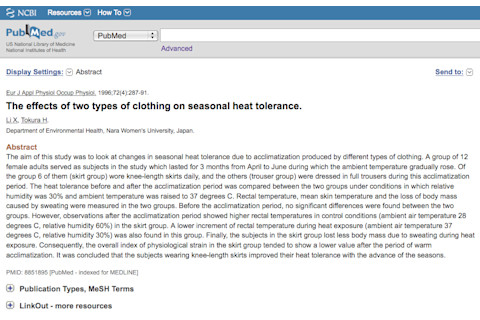 The effects of two types of clothing on seasonal heat tolerance. "The aim of this study was to look at changes in seasonal heat tolerance due to acclimatization produced by different types of clothing. A group of 12 female adults served as subjects in the study which lasted for 3 months from April to June during which the ambient temperature gradually rose. Of the group 6 of them (skirt group) wore knee-length skirts daily, and the others (trouser group) were dressed in full trousers during this acclimatization period. The heat tolerance before and after the acclimatization period was compared between the two groups under conditions in which relative humidity was 30% and ambient temperature was raised to 37 degrees C. Rectal temperature, mean skin temperature and the loss of body mass caused by sweating were measured in the two groups. Before the acclimatization period, no significant differences were found between the two groups. However, observations after the acclimatization period showed higher rectal temperatures in control conditions (ambient air temperature 28 degrees C, relative humidity 60%) in the skirt group. A lower increment of rectal temperature during heat exposure (ambient air temperature 37 degrees C, relative humidity 30%) was also found in this group. Finally, the subjects in the skirt group lost less body mass due to sweating during heat exposure. Consequently, the overall index of physiological strain in the skirt group tended to show a lower value after the period of warm acclimatization. It was concluded that the subjects wearing knee-length skirts improved their heat tolerance with the advance of the seasons."