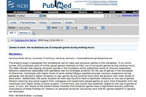 "In an online survey, 833 employed users of online casual games reported on their use of computer games during working hours... Furthermore, individuals with higher levels of work-related fatigue reported stronger recovery experience during gameplay and showed a higher tendency to play games during working hours than did persons with lower levels of work strain. Additionally, the social situation at work was found to have a significant influence on the use of games. Persons receiving less social support from colleagues and supervisors played games at work more frequently than did individuals with higher levels of social support. Furthermore, job control was positively related to the use of games at work."