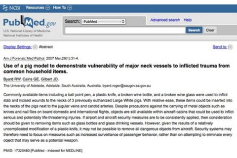 "Commonly available items including a ball point pen, a plastic knife, a broken wine bottle, and a broken wine glass were used to inflict stab and incised wounds to the necks of 3 previously euthanized Large White pigs. With relative ease, these items could be inserted into the necks of the pigs next to the jugular veins and carotid arteries. Despite precautions against the carrying of metal objects such as knives and nail files on board domestic and international flights, objects are still available within aircraft cabins that could be used to inflict serious and potentially life-threatening injuries. If airport and aircraft security measures are to be consistently applied, then consideration should be given to removing items such as glass bottles and glass drinking vessels. However, given the results of a relatively uncomplicated modification of a plastic knife, it may not be possible to remove all dangerous objects from aircraft. Security systems may therefore need to focus on measures such as increased surveillance of passenger behavior, rather than on attempting to eliminate every object that may serve as a potential weapon."