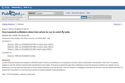 "Current theory proposes that baseball outfielders catch fly balls by selecting a running path to achieve optical acceleration cancellation of the ball. Yet people appear to lack the ability to discriminate accelerations accurately. This study supports the idea that outfielders convert the temporal problem to a spatial one by selecting a running path that maintains a linear optical trajectory (LOT) for the ball. The LOT model is a strategy of maintaining "control" over the relative direction of optical ball movement in a manner that is similar to simple predator tracking behavior."