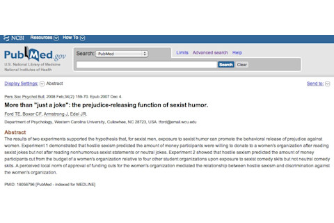 More than "just a joke": the prejudice-releasing function of sexist humor. "The results of two experiments supported the hypothesis that, for sexist men, exposure to sexist humor can promote the behavioral release of prejudice against women. Experiment 1 demonstrated that hostile sexism predicted the amount of money participants were willing to donate to a women's organization after reading sexist jokes but not after reading nonhumorous sexist statements or neutral jokes. Experiment 2 showed that hostile sexism predicted the amount of money participants cut from the budget of a women's organization relative to four other student organizations upon exposure to sexist comedy skits but not neutral comedy skits. A perceived local norm of approval of funding cuts for the women's organization mediated the relationship between hostile sexism and discrimination against the women's organization." Bonus excerpt from the materials and methods: "Participants in the sexist joke condition then read one neutral joke followed by four sexist jokes. The sexist jokes required the recipient to know various female stereotypes or gender role stereotypes to “get” the punch lines (e.g., “How can you tell if a blonde’s been using the computer? There’s White-Out on the screen!” and “A man and a woman were stranded in an elevator and they knew they were gonna die. The woman turns to the man and says, ‘Make me feel like a woman before I die.’ So he takes off his clothes and says, ‘Fold them!’”). Participants in the neutral joke condition read five neutral (nonsexist) jokes (e.g., “What’s the difference between a golfer and a skydiver? A golfer goes whack . . . ‘Damn!’ A skydiver goes ‘Damn!’ . . . whack”). Pretest ratings indicated that participants perceived the sexist jokes as more sexist but equally as funny as the neutral jokes (see Ford, 2000)."
