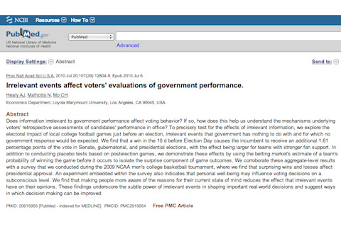 "Does information irrelevant to government performance affect voting behavior? If so, how does this help us understand the mechanisms underlying voters' retrospective assessments of candidates' performance in office? To precisely test for the effects of irrelevant information, we explore the electoral impact of local college football games just before an election, irrelevant events that government has nothing to do with and for which no government response would be expected. We find that a win in the 10 d before Election Day causes the incumbent to receive an additional 1.61 percentage points of the vote in Senate, gubernatorial, and presidential elections, with the effect being larger for teams with stronger fan support. In addition to conducting placebo tests based on postelection games, we demonstrate these effects by using the betting market's estimate of a team's probability of winning the game before it occurs to isolate the surprise component of game outcomes. We corroborate these aggregate-level results with a survey that we conducted during the 2009 NCAA men's college basketball tournament, where we find that surprising wins and losses affect presidential approval. An experiment embedded within the survey also indicates that personal well-being may influence voting decisions on a subconscious level. We find that making people more aware of the reasons for their current state of mind reduces the effect that irrelevant events have on their opinions. These findings underscore the subtle power of irrelevant events in shaping important real-world decisions and suggest ways in which decision making can be improved."