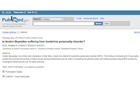 Is Anakin Skywalker suffering from borderline personality disorder? "Anakin Skywalker, one of the main characters in Star Wars, meets the criteria for borderline personality disorder (BPD). This finding is interesting for it may partly explain the commercial success of these movies among adolescents and be useful in educating the general public and medical students about BPD symptoms." Bonus quote from the full article: "He presented impulsivity and difficulty controlling his anger and alternated between idealisation and devaluation (of his Jedi mentors). Permanently afraid of losing his wife, he made frantic efforts to avoid her abandonment and went as far as betraying his former Jedi companions. He also experienced two dissociative episodes secondary to stressful events. One occurred after his mother's death, when he exterminated a whole tribe of Tuskan people, while the other one took place just after he turned to the dark side. He slaughtered all the Jedi younglings before voicing paranoid thoughts concerning his former mentor and his wife. Finally, the films depicted his quest to find himself, and his uncertainties about who he was. Turning to the dark side and changing his name could be interpreted as a sign of identity disturbance. Thus, even if developmental issues in a gifted child as he struggled with adolescence and young adulthood could also be discussed, Anakin Skywalker presents both psychodynamic and criteriological features suggesting BPD."