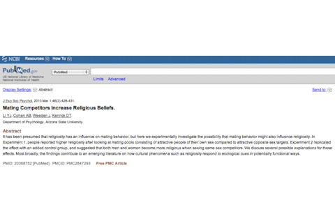 "It has been presumed that religiosity has an influence on mating behavior, but here we experimentally investigate the possibility that mating behavior might also influence religiosity. In Experiment 1, people reported higher religiosity after looking at mating pools consisting of attractive people of their own sex compared to attractive opposite sex targets. Experiment 2 replicated the effect with an added control group, and suggested that both men and women become more religious when seeing same sex competitors. We discuss several possible explanations for these effects. Most broadly, the findings contribute to an emerging literature on how cultural phenomena such as religiosity respond to ecological cues in potentially functional ways."