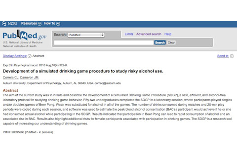 "The aim of the current study was to initiate and describe the development of a Simulated Drinking Game Procedure (SDGP), a safe, efficient, and alcohol-free laboratory protocol for studying drinking game behavior. Fifty-two undergraduates completed the SDGP in a laboratory session, where participants played singles and/or doubles games of Beer Pong. Water was substituted for alcohol in all of the games. The number of drinks consumed during matches and 20-min play periods were coded during each session, and software was used to estimate the peak blood alcohol concentration (BAC) a participant would achieve if he or she had consumed actual alcohol while participating in the SDGP. Results indicated that participation in Beer Pong can lead to rapid consumption of alcohol and an associated rise in BAC. Results also highlight additional risks for female participants associated with participation in drinking games. The SDGP is a research tool capable of increasing our understanding of drinking games."