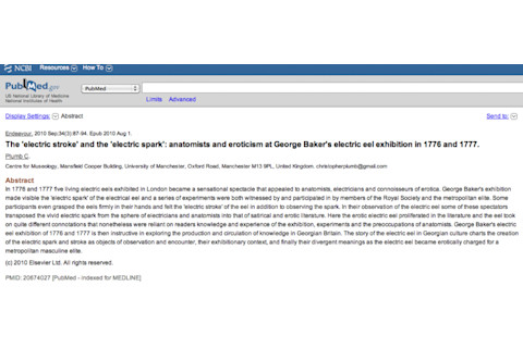 "In 1776 and 1777 five living electric eels exhibited in London became a sensational spectacle that appealed to anatomists, electricians and connoisseurs of erotica. George Baker's exhibition made visible the 'electric spark' of the electrical eel and a series of experiments were both witnessed by and participated in by members of the Royal Society and the metropolitan elite. Some participants even grasped the eels firmly in their hands and felt the 'electric stroke' of the eel in addition to observing the spark. In their observation of the electric eel some of these spectators transposed the vivid electric spark from the sphere of electricians and anatomists into that of satirical and erotic literature. Here the erotic electric eel proliferated in the literature and the eel took on quite different connotations that nonetheless were reliant on readers knowledge and experience of the exhibition, experiments and the preoccupations of anatomists. George Baker's electric eel exhibition of 1776 and 1777 is then instructive in exploring the production and circulation of knowledge in Georgian Britain. The story of the electric eel in Georgian culture charts the creation of the electric spark and stroke as objects of observation and encounter, their exhibitionary context, and finally their divergent meanings as the electric eel became erotically charged for a metropolitan masculine elite."