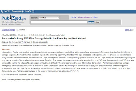 Related content: Discoblog: NCBI ROFL: Vacuum cleaner injury to penis: a common urologic problem? Discoblog: NCBI ROFL: Ever wonder how much electricity your penis can take? Discoblog: NCBI ROFL: A vacuum device for penile elongation: fact or fiction? WTF is NCBI ROFL? Read our FAQ!