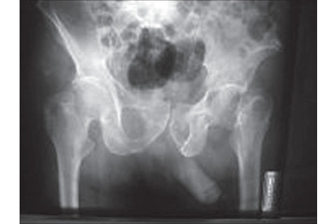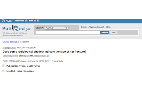 Does penis radiological shadow indicate the side of hip fracture? "Sir, Hip fractures are common injuries in the elderly. Standard radiographic evaluation of the hip includes an anteroposterior (AP) view of the pelvis. For this additional purpose, radiograph of the pelvis is one of the commonest prescribed radiographs in emergency departments. Usually we notice the fractured hip side and the type of fracture, whenever we are looking at an anteroposterior pelvis radiograph. But we do not question if this radiograph represents a true anteroposterior view. We have noticed that the radiological shadow of the penis almost always turns to the side of the hip fracture in male patients and especially in displaced fractures. Many surgeons have tried to explain this observation. So we would like to test the hypothesis that the radiological shadow of the penis indicates the side of the hip fracture. In our retrospective study, 712 male patients with hip fracture were included. In order to test our hypothesis we studied their first pelvis radiograph on admission, before operation. Intertrochanteric hip fracture was noticed in 475 cases and subcapital hip fracture in 237 cases. All the patients had no history of previous hip fracture, hip osteoarthritis, spinal cord disorders, hernia or congenital penis disorders. The mean age of the patients was 78.6 (range 68-83) years. Statistical analysis was performed by chi-square analysis. The position of patients during the anteroposterior pelvis radiograph may explain this observation. Patients with a displaced hip fracture exhibit the classic presentation of a shortened and externally rotated extremity. We believe that the patients in order to avoid further external rotation of their leg, turn their pelvis and body to the fractured side, so as to immobilize the fracture and to reduce pain. This means that the penis follows the fracture because the pelvis turns to the fractured side. So the anteroposterior view of the pelvis is in fact an oblique view, which shows the fracture and the penis shadow on the same side."
