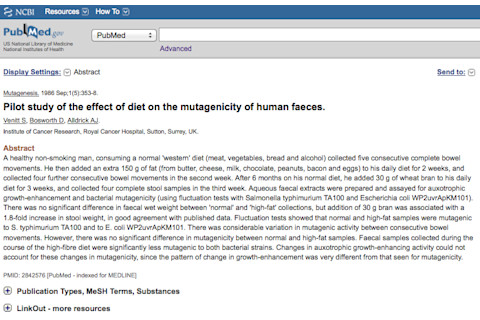 "A healthy non-smoking man, consuming a normal 'western' diet (meat, vegetables, bread and alcohol) collected five consecutive complete bowel movements. He then added an extra 150 g of fat (from butter, cheese, milk, chocolate, peanuts, bacon and eggs) to his daily diet for 2 weeks, and collected four further consecutive bowel movements in the second week. After 6 months on his normal diet, he added 30 g of wheat bran to his daily diet for 3 weeks, and collected four complete stool samples in the third week. Aqueous faecal extracts were prepared and assayed for auxotrophic growth-enhancement and bacterial mutagenicity (using fluctuation tests with Salmonella typhimurium TA100 and Escherichia coli WP2uvrApKM101). There was no significant difference in faecal wet weight between 'normal' and 'high-fat' collections, but addition of 30 g bran was associated with a 1.8-fold increase in stool weight, in good agreement with published data. Fluctuation tests showed that normal and high-fat samples were mutagenic to S. typhimurium TA100 and to E. coli WP2uvrApKM101. There was considerable variation in mutagenic activity between consecutive bowel movements. However, there was no significant difference in mutagenicity between normal and high-fat samples. Faecal samples collected during the course of the high-fibre diet were significantly less mutagenic to both bacterial strains. Changes in auxotrophic growth-enhancing activity could not account for these changes in mutagenicity, since the pattern of change in growth-enhancement was very different from that seen for mutagenicity."