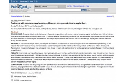 "BACKGROUND: One potentially important antecedent of experiencing problems with condom use during penile-vaginal sex is the amount of time that men (and perhaps women) allow for condom application. To examine whether men reporting that ample time was available to apply a male condom (the last time a condom was used for penile-vaginal sex) were also less likely to report problems with condom use such as breakage, slippage and erection difficulties during that sexual event. METHODS: A convenience sample of men (n = 440) was recruited via advertisements in newspapers (two urban and one small town) and a blog on the website of a condom sales company. Men completed a questionnaire posted on the website of The Kinsey Institute for Research in Sex, Gender, and Reproduction. Inclusion criteria were that participants were: at least 18 years old; used condoms for penile-vaginal intercourse in the past 3 months; and able to read English. RESULTS: In controlled, event-specific analyses, men reporting that they did not have sufficient time for condom application were ~three times more likely to report breakage and approximately 2.4 times more likely to report slippage. In addition, men who reported that they lacked time for condom application were approximately 2.4 times more likely to experience any of nine sexual problems, 3.4 times more likely to report difficulty with erection, 2.1 times more likely to report reduced sexual pleasure, 2.2 times more likely to report reduced sexual pleasure of their female partner and 2.6 times more likely to report that the condom irritated their partner's vagina. CONCLUSIONS: This is the first study using an event-specific analysis to examine the effect of not having enough time for condom application on condom breakage, slippage and several outcomes related to sexual pleasure. Sexually transmissible infections and pregnancy prevention messages should include recommendations to men to take their time applying condoms."