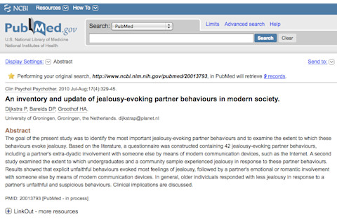An inventory and update of jealousy-evoking partner behaviours in modern society. "The goal of the present study was to identify the most important jealousy-evoking partner behaviours and to examine the extent to which these behaviours evoke jealousy. Based on the literature, a questionnaire was constructed containing 42 jealousy-evoking partner behaviours, including a partner's extra-dyadic involvement with someone else by means of modern communication devices, such as the Internet. A second study examined the extent to which undergraduates and a community sample experienced jealousy in response to these partner behaviours. Results showed that explicit unfaithful behaviours evoked most feelings of jealousy, followed by a partner's emotional or romantic involvement with someone else by means of modern communication devices. In general, older individuals responded with less jealousy in response to a partner's unfaithful and suspicious behaviours. Clinical implications are discussed."