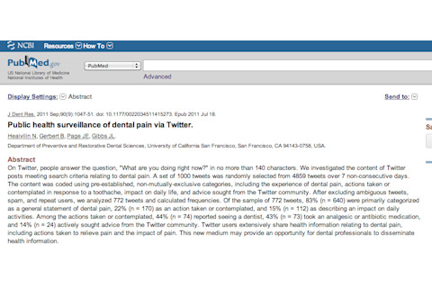 "On Twitter, people answer the question, "What are you doing right now?" in no more than 140 characters. We investigated the content of Twitter posts meeting search criteria relating to dental pain. A set of 1000 tweets was randomly selected from 4859 tweets over 7 non-consecutive days. The content was coded using pre-established, non-mutually-exclusive categories, including the experience of dental pain, actions taken or contemplated in response to a toothache, impact on daily life, and advice sought from the Twitter community. After excluding ambiguous tweets, spam, and repeat users, we analyzed 772 tweets and calculated frequencies. Of the sample of 772 tweets, 83% (n = 640) were primarily categorized as a general statement of dental pain, 22% (n = 170) as an action taken or contemplated, and 15% (n = 112) as describing an impact on daily activities. Among the actions taken or contemplated, 44% (n = 74) reported seeing a dentist, 43% (n = 73) took an analgesic or antibiotic medication, and 14% (n = 24) actively sought advice from the Twitter community. Twitter users extensively share health information relating to dental pain, including actions taken to relieve pain and the impact of pain. This new medium may provide an opportunity for dental professionals to disseminate health information."