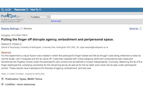 Pulling the finger off disrupts agency, embodiment and peripersonal space. "For this experiment a visual illusion was created in which the participant's finger looked and felt as though it was being stretched to twice its normal length until it snapped and the tip came off. It was then stabbed with virtual weapons while skin conductance was measured. Sometimes the fingertip moved under the participant's own control and sometimes it moved independently. Curiously, detaching the tip of the finger destroyed the underlying ownership for the remaining stump as well as for the tip itself, even when the tip was under participants' control. These results have implications for theories of agency, embodiment, and tool-use." Bonus figure from the full text: