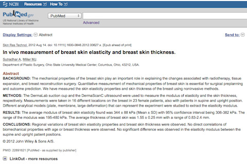 In vivo measurement of breast skin elasticity and breast skin thickness. "BACKGROUND:The mechanical properties of the breast skin play an important role in explaining the changes associated with radiotherapy, tissue expansion, and breast reconstruction surgery. Quantitative measurement of mechanical properties of breast skin is essential for surgical preplanning and outcome prediction. We have measured the skin elasticity properties and skin thickness of the breast using noninvasive methods. METHODS:The DermaLab suction cup and the DermaScanC ultrasound were used to measure the modulus of elasticity and the skin thickness, respectively. Measurements were taken in 16 different locations on the breast in 23 female patients, also with patients in supine and upright position. Different analytical models (plate, membrane, large deformation) that can represent the experiment were studied to extract the elasticity modulus. RESULTS:The average modulus of breast skin elasticity found was 344 ± 88 kPa (Mean ± SD) with 95% confidence interval being 306-382 kPa. The range of the modulus was 195-480 kPa. The average thickness of breast skin was 1.55 ± 0.25 mm with a range of 0.83-2.4 mm. CONCLUSIONS:Regional variations of breast skin elasticity properties and breast skin thickness were observed. No direct correlations of biomechanical properties with age or breast thickness were observed. No significant difference was observed in the elasticity modulus between the supine and upright patient positions."