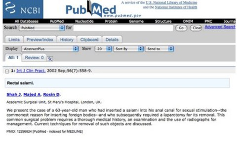 "We present the case of a 63-year-old man who had inserted a salami into his anal canal for sexual stimulation--the commonest reason for inserting foreign bodies--and who subsequently required a laparotomy for its removal. This common surgical problem requires a thorough medical history, an examination and the use of radiographs for management. Current techniques for removal of such objects are discussed."