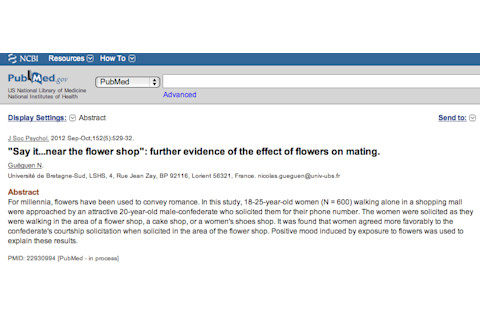 "For millennia, flowers have been used to convey romance. In this study, 18-25-year-old women (N = 600) walking alone in a shopping mall were approached by an attractive 20-year-old male-confederate who solicited them for their phone number. The women were solicited as they were walking in the area of a flower shop, a cake shop, or a women's shoes shop. It was found that women agreed more favorably to the confederate's courtship solicitation when solicited in the area of the flower shop. Positive mood induced by exposure to flowers was used to explain these results."