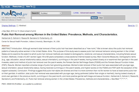 Pubic Hair Removal among Women in the United States: Prevalence, Methods, and Characteristics "Introduction. Although women's total removal of their pubic hair has been described as a "new norm," little is known about the pubic hair removal patterns of sexually active women in the United States. Aims. The purpose of this study was to assess pubic hair removal behavior among women in the United States and to examine the extent to which pubic hair removal methods are related to demographic, relational, and sexual characteristics, including female sexual function. Methods. A total of 2,451 women ages 18 to 68 years completed a cross-sectional Internet-based survey. Main Outcome Measures. Demographic items (e.g., age, education, sexual relationship status, sexual orientation), cunnilingus in the past 4 weeks, having looked closely at or examined their genitals in the past 4 weeks, extent and method of pubic hair removal over the past 4 weeks, the Female Genital Self-Image Scale (FGSIS) and the Female Sexual Function Index (FSFI). Results. Women reported a diverse range of pubic hair-grooming practices. Women's total removal of their pubic hair was associated with younger age, sexual orientation, sexual relationship status, having received cunnilingus in the past 4 weeks, and higher scores on the FGSIS and FSFI (with the exception of the orgasm subscale). Conclusion. Findings suggest that pubic hair styles are diverse and that it is more common than not for women to have at least some pubic hair on their genitals. In addition, total pubic hair removal was associated with younger age, being partnered (rather than single or married), having looked closely at one's own genitals in the previous month, cunnilingus in the past month, and more positive genital self-image and sexual function."
