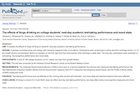 The effects of binge drinking on college students' next-day academic test-taking performance and mood state. "AIM: To assess the effects of binge drinking on students' next-day academic test-taking performance. DESIGN: A placebo-controlled cross-over design with randomly assigned order of conditions. Participants were randomized to either alcoholic beverage [mean = 0.12 g% breath alcohol concentration (BrAC)] or placebo on the first night and then received the other beverage a week later. The next day, participants were assessed on test-taking, neurocognitive performance and mood state. PARTICIPANTS: A total of 196 college students (>or=21 years) recruited from greater Boston. SETTING: The trial was conducted at the General Clinical Research Center at the Boston Medical Center. MEASUREMENTS: The Graduate Record Examinations(c) (GREs) and a quiz on a lecture presented the previous day measured test-taking performance; the Neurobehavioral Evaluation System (NES3) and the Psychomotor Vigilance Test (PVT) measured neurocognitive performance; and the Profile of Mood States (POMS) measured mood. FINDINGS: Test-taking performance was not affected on the morning after alcohol administration, but mood state and attention/reaction-time were affected. CONCLUSION: Drinking to a level of 0.12 g% BrAC does not affect next-day test-taking performance, but does affect some neurocognitive measures and mood state."