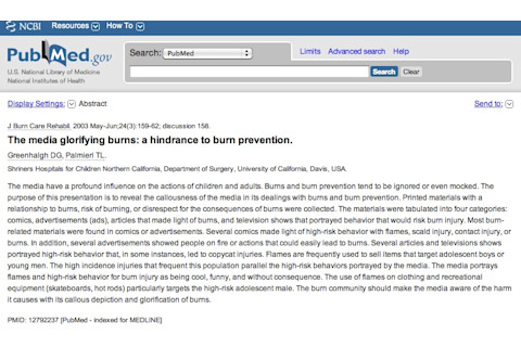 The media glorifying burns: a hindrance to burn prevention. "The media have a profound influence on the actions of children and adults. Burns and burn prevention tend to be ignored or even mocked. The purpose of this presentation is to reveal the callousness of the media in its dealings with burns and burn prevention. Printed materials with a relationship to burns, risk of burning, or disrespect for the consequences of burns were collected. The materials were tabulated into four categories: comics, advertisements (ads), articles that made light of burns, and television shows that portrayed behavior that would risk burn injury. Most burn-related materials were found in comics or advertisements. Several comics made light of high-risk behavior with flames, scald injury, contact injury, or burns. In addition, several advertisements showed people on fire or actions that could easily lead to burns. Several articles and televisions shows portrayed high-risk behavior that, in some instances, led to copycat injuries. Flames are frequently used to sell items that target adolescent boys or young men. The high incidence injuries that frequent this population parallel the high-risk behaviors portrayed by the media. The media portrays flames and high-risk behavior for burn injury as being cool, funny, and without consequence. The use of flames on clothing and recreational equipment (skateboards, hot rods) particularly targets the high-risk adolescent male. The burn community should make the media aware of the harm it causes with its callous depiction and glorification of burns."