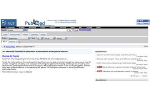 "To test the hunter-gatherer theory of cognitive sex differences, men and women each played four video games on a Wii console: two games simulating skills necessary for hunting (navigation and shooting) and two games simulating skills necessary for gathering (fine motor and visual search). Men outperformed women on the two hunting games, whereas there were no sex differences on the gathering skill games. The findings are discussed in terms of evolutionary psychology theory."