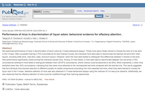 It's smelly week on NCBI ROFL! All week long we'll feature the funniest papers about the science of stink. Enjoy!Performance of mice in discrimination of liquor odors: behavioral evidence for olfactory attention. "We examined performance of mice in discrimination of liquor odors by Y-maze behavioral assays. Thirsty mice were initially trained to choose the odor of a red wine in the Y-maze. After successful training (>70% concordance for each trained mouse), the individual mice were able to discriminate the learned red wine from other liquors, including white wine, rosé wine, sake, and plum liqueur. However, when the mice were tested to distinguish fine differences between 2 brands of red wine, their performance significantly varied among the individual trained mice. Among 10 mice tested, 2 mice were able to discriminate between the red wines (>75% concordance) whereas 6 mice failed to distinguish between them (50-67% concordance, where chance could be assumed to be 50%). More importantly, 2 other mice exhibited lower than 30% concordance, indicating that they were more attracted to the nonrewarded red wine compared with the learned one. This result suggested that the individual mice directed attention to different subsets of volatile components emanating from the rewarded red wine, when they were trained to choose the liquor odor in the Y-maze. Selective attention of mice was also observed in Y-maze behavioral assays using the mixtures of 3 or less pure odorants. Additionally, we also observed that the olfactory attention of mice could be modified through their learning experiences."