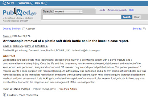 Arthroscopic removal of a plastic soft drink bottle cap in the knee: a case report. "We report a rare case of late knee locking after an open knee injury in a polytrauma patient with a pelvic fracture and a contralateral femoral artery injury. Once the life and limb threatening injuries were addressed, debridement and washout of the knee wound was performed. X-rays and subsequent CT revealed only an undisplaced patella fracture. The patient presented 6 months later to a knee surgeon with recurrent locking. An arthroscopy was performed and a 10 mm plastic soft drink bottle cap was retrieved leading to the immediate resolution of symptoms without complications. Open knee injuries require thorough debridement washout and joint assessment. Late locking should raise the suspicion of an intra-articular loose or foreign body. Arthroscopy is an excellent first line tool in the diagnosis and late management of this unusual problem."
