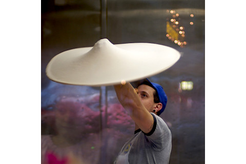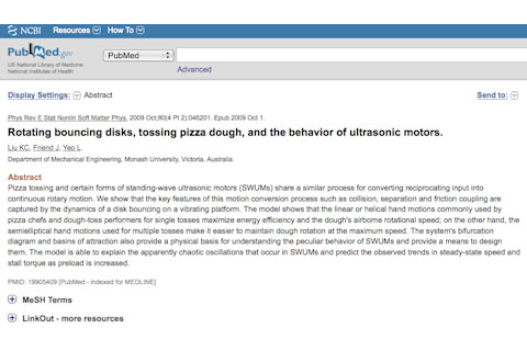 Rotating bouncing disks, tossing pizza dough, and the behavior of ultrasonic motors. "Pizza tossing and certain forms of standing-wave ultrasonic motors (SWUMs) share a similar process for converting reciprocating input into continuous rotary motion. We show that the key features of this motion conversion process such as collision, separation and friction coupling are captured by the dynamics of a disk bouncing on a vibrating platform. The model shows that the linear or helical hand motions commonly used by pizza chefs and dough-toss performers for single tosses maximize energy efficiency and the dough's airborne rotational speed; on the other hand, the semielliptical hand motions used for multiple tosses make it easier to maintain dough rotation at the maximum speed. The system's bifurcation diagram and basins of attraction also provide a physical basis for understanding the peculiar behavior of SWUMs and provide a means to design them. The model is able to explain the apparently chaotic oscillations that occur in SWUMs and predict the observed trends in steady-state speed and stall torque as preload is increased."